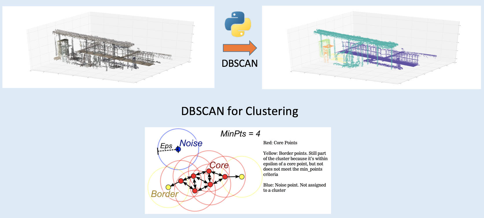 Or we can say "image segmentation" as "object clustering", a more machine learning term. Python can read point cloud files in las format, thanks to the laspy package. The point set is not labeled, so we cannot use any pre-trained model and supervised machine learning techniques to classify these points. More sophisticated unsupervised machine learning techniques should be used for clustering. I found that DBSCAN is the best tool to cluster a set of un-labeled points with unknown number of subsets. It is a density-based clustering non-parametric algorithm. The following figure shows how a point set are segmented into a number of sub-sets. Actually DBSCAN clustered the left panel to hundreds of clusters with hundreds/thousands noise points. I removed all noise points and only selected several top clusters with most points. Note that each (fake) color stands for one subset of points.