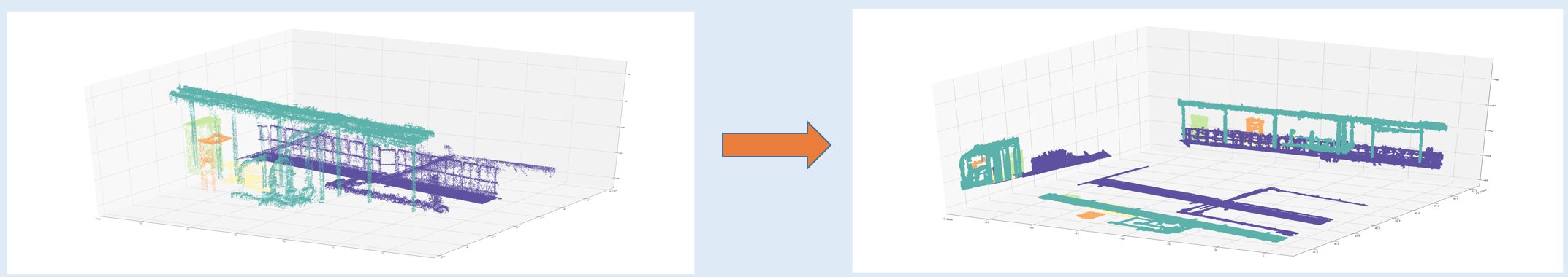 We consider each subset of points as one object. For example, we can identify some objects in above figure "by eye". The light blue object is a pipe candidate, the purple one is a fence-like object, and green and orange ones are more like small boxes. The issue is that, how can we identify them by computer, and select the pipe candidate automatically?