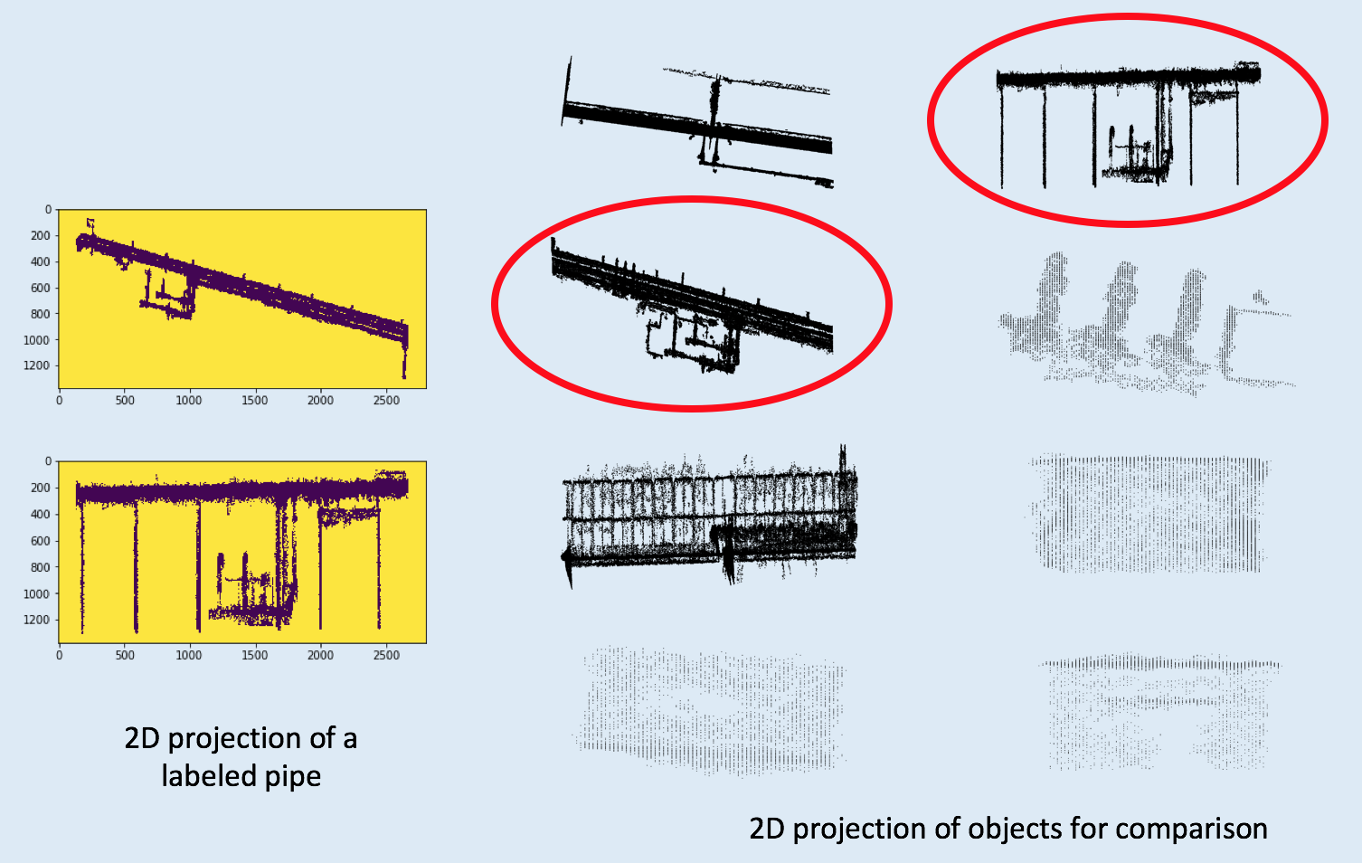 Now I can collect a number of 2D images, which belong to a variety of 3D objects. These 2D images can be compared to the 2D projection of a pre-labeled pipe using ORB, and the projection of pipe candidates can be selected among 2D images. As the instruction figures shown below, the cycled ones belong to xy and yz plane-projection of a pipe candidate.