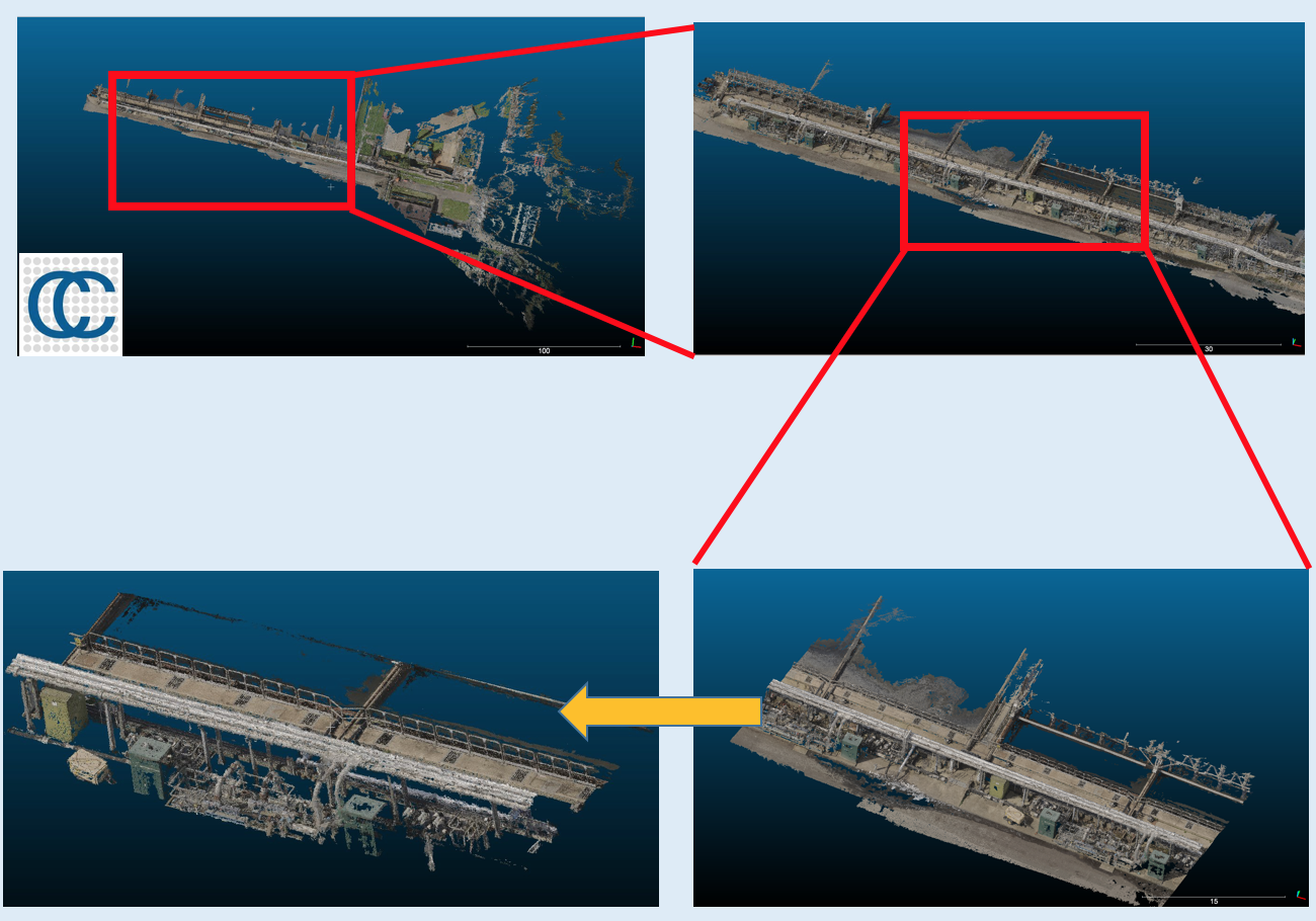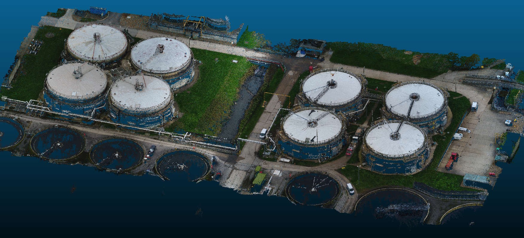 The raw data is from a startup company Hybird Tech, which has taken large volumes of photos by drones and generate 3D point cloud images of water treatment plants and pipes. Each 3D image is 2-10 GB with 50-100 million point datasets, and each point includes (x,y,z) coordinates, RGB information and other dimensions. Point cloud data can be opened by Global Mapper, or CloudCompare . I took snapshot of two images.