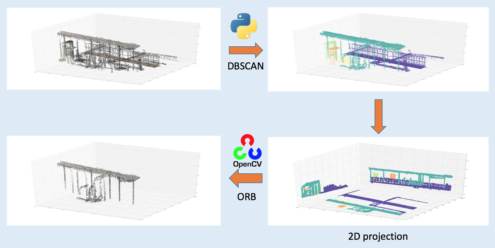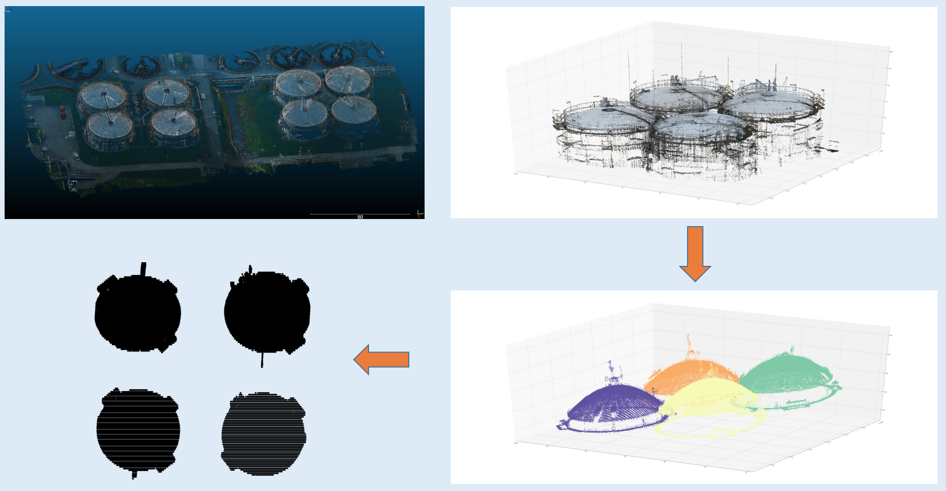 I used very similar method to find tanks in 3D cloud point images. The original 3D image is for a water treatment plants taken by a startup company. The first step is to read part of the image into python, and data segmentation and classification started from the python-read image. Then I used DBSCAN to cluster objects, and select top/major objects for identification. The projections of these objects give us a hint to find tanks: they should be cycle-like. The following figure shows the pipeline to segment image and find tanks.
