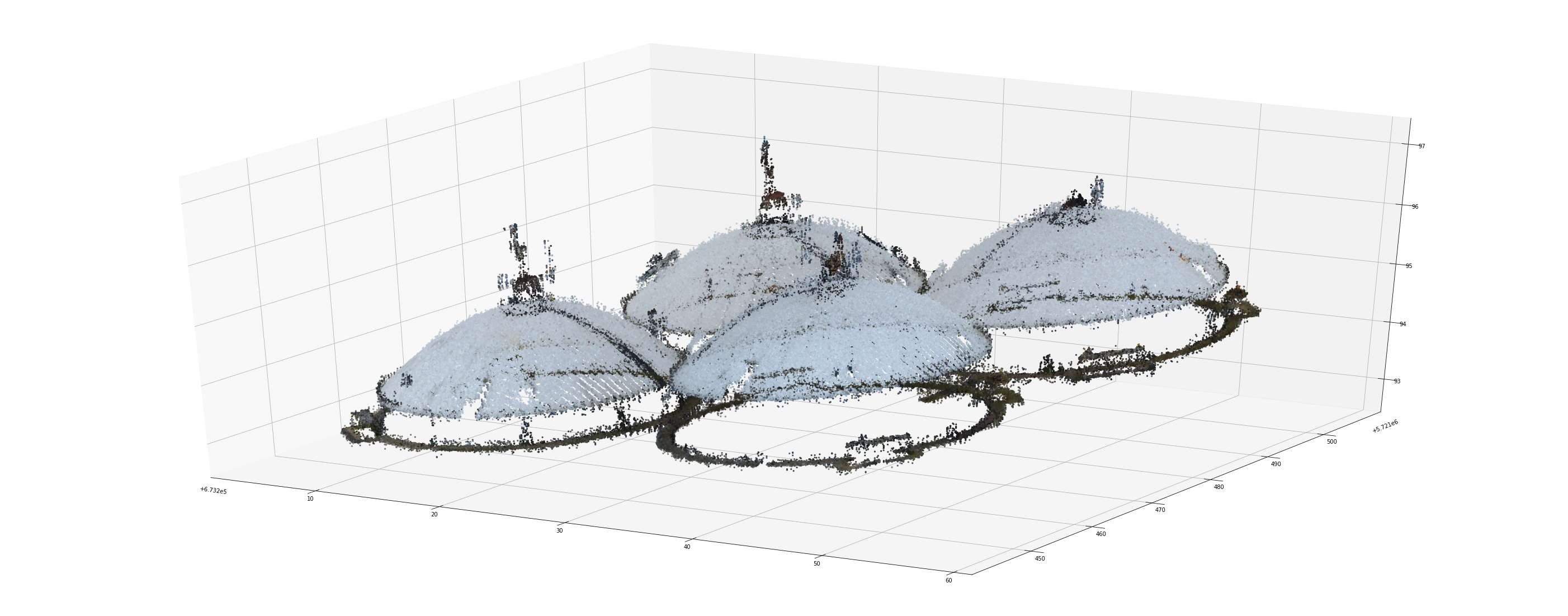 In order to use the data efficiently, I zoomed in the original image to select a small "local" part for processing. A typical "local" 3D data has 1-2 million points. The following figure shows the zoom-in selection using CloudCompare.