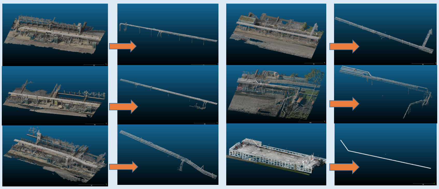 Using my tool described above, I help energy industry companies to better use their 3D images. In particular, currently 3D asset component segmentation and labeling are pretty time-consuming. For example, for a 3D image of water treatment factory with 50 million points, it takes a person 3-4 hours to label pipes in the image. My tool can provide an automatic way to select pipes, and tanks. Potentially this technique may not only be implemented to do real-time inspection for energy assets, but for all 3D computer-vision-related industry.