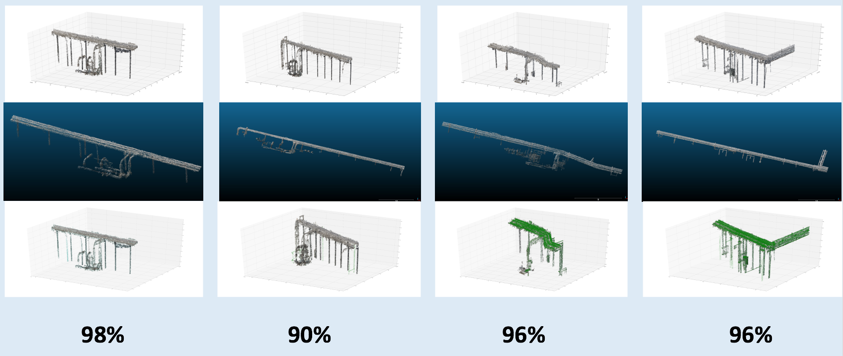 I also introduced another more quantitative way to check my pipe finder quality. Given a local 3D image, I first used CloudCompare to label the pipe in the image by hand, then I used my tool to automatically select the pipe in the image. Now I check the overlapping between them, and score the overlapping quality. The results are shown in the following figure. The first row shows pipes found by my tool from four images respectively, the second row gives the manually labeled pipes by CloudCompare, and in the third row shows overlapping between them. The overlapping can be scored by (point clouds which belong to both of them)/(total number of point clouds of the labeled pipe). The scores are pretty good, most of them are above 95%.